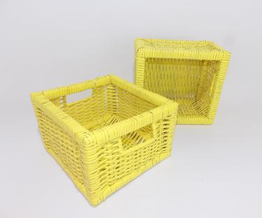 Pair Yellow Wicker Baskets Square Vintage Handle Storage Bin