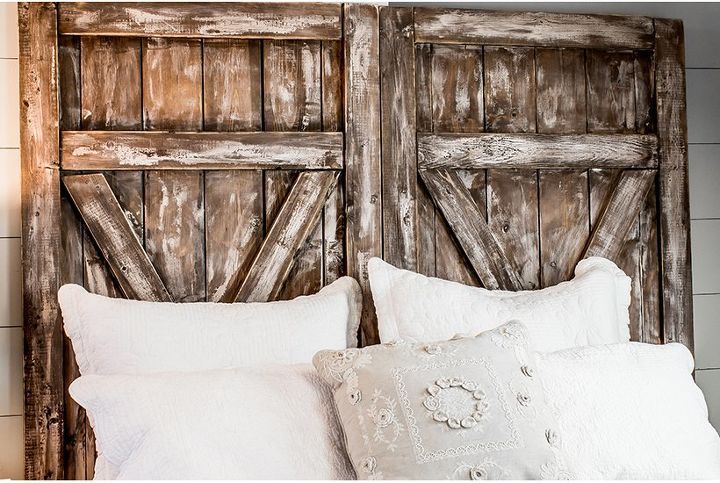 A Rustic Farmhouse Bedroom With A Vintage Door Headboard